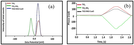 The surface charge of the TiO2, TiO2-NH2, and TiO2-NH2-CuxO nanophotocatalysts were investigated by performing the zeta potential measurements and the results were presented in Figure 4a. It is very clear that upon the attachment of the CuxO to the amine group of the TiO2, the potential was almost equally shifted to the negative side due to the positive charge of copper, which was also confirmed by measuring the phase over time, as shown in Figure 4b. The higher surface charge was measured for TiO2 and TiO2-NH2 which indicates the stability due to the charge distribution on the particle surface, such that the negatively charged particle surfaces repulse each other in the solution. However, when the CuxO was attached (TiO2-NH2-CuxO) to the amine group, there was a possibility of a hydroxyl group formation on the surface upon dispersion in water, which led to a negative shift in the Zeta potential [32,33]. In all the cases, the nanoparticles were highly suspended in water which is impartment to have direct contact between the photocatalyst and pollutants for greater efficiency.