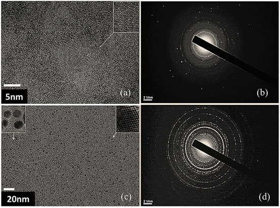 Further investigation on the morphological structure was performed on the TiO2, and TiO2- NH2-CuxO nanophotocatalyst using HR-TEM, and selected area electron diffraction (SAED) as shown in Figure 6. The HR-TEM images of TiO2 (a) and its SAED pattern Figure 6b in comparison with TiO2-NH2-CuxO nanophotocatalyst SAED pattern confirmed the formation of additional crystalline structures beside the TiO2 crystalline structure, as compared between Figure 6b and d. The additional diffraction pattern confirms the (1 1 1) and (2 2 0) phases which could be assigned to copper oxide. The intensity of the diffraction pattern Debye rings in Figure 6d was clearly due to the loading of CuxO on the surface, which is consistent with the EDX results.