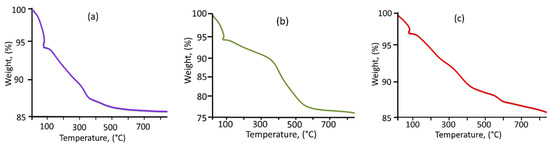 Figure 7. Thermogravimetric analyses of TiO2 (a), TiO2-NH2 (b), and TiO2-NH2-CuxO (c).