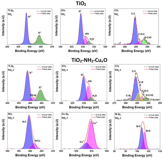 Figure 8. X-ray photoelectron spectroscopy (XPS) for synthesized TiO2 and TiO2-NH2-CuxO nanophotocatalyst.