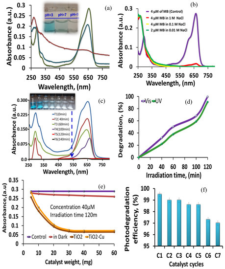 Figure 10. (a) UV–vis absorption spectra of MB-TiO2-NH2-CuxO at pH = 3 (I); pH = 7 (II); and pH = 9 (III). (b) Effect of ionic strength on the MB degradation. (c) Degradation of MB using TiO2-NH2-CuxO nanophotocatalyst as a function of time (T1 = 0 min, T6 = 140 min). (d) Impact of irradiation time on the degradation of MB in UV and visible light. (e) Catalyst capacity. (f) Study of efficiency of the catalyst after reuse for six cycles.
