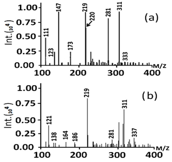 Figure 11. (a) Mass spectrum of the MB degradation using TiO2-NH2-CuxO nanophotocatalyst at 40 min and (b) after 60 min.