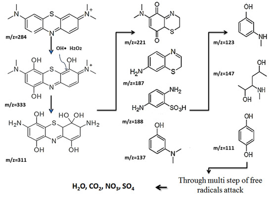 The degradation of the MB dye using the TiO2-NH2-CuxO nanophotocatalyst under visible light was investigated using Liquid chromatography-mass spectrometry (LC-MS) to elucidate the degradation pathway. The chromatograms of the degraded compounds after 40 min and 60 min of irradiation are shown in Figure 11a,b, respectively. The TiO2-NH2-CuxO nanophotocatalyst can degrade MB dye in visible light through multiple steps as shown in Figure 12, which illustrated that the hydroxyl free radical reacted MB dye molecule. After that, the produced molecules start to cleave through the multi-steps due to the free radical’s attack, and it ends with colorless compounds (H2O, CO2, NO2, SO42−).