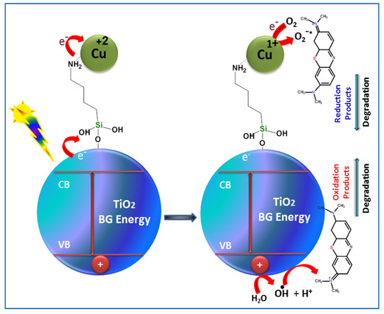 Mechanism: the mechanism of the photocatalytic activity of the synthesized materials is illustrated in Figure 13, which postulate that the TiO2 within the TiO2-NH2-CuxO nanophotocatalyst releases the electrons from the valence band by exposure to the light and the CuxO works as a reservoir to collect the electrons underneath the conduction band, and therefore minimizes the bandgap energy which makes the catalyst very effective in visible light. Also, it is postulated that the high surface area anatase phase TiO2 decorated with homogeneously distributed CuxO nanoparticles can cause a large surface area exposure to the MB dye and thus increase the photocatalytic degradation effectiveness. In general, the hydroxyl radical and peroxide ion can be initiated due to the existence of holes and electrons in the TiO2 nanoparticle solution bypassing the UV light. These energetic molecules destroy the organic compound through a series of chemical reactions as the potential of ·OH is 2.8 V, which is higher than other oxidant agents such as hypochlorous acid (1.49 V) [39]. Moreover, it is well known that TiO2 is more suitable only for UV light range due to its bandgap, and to make the TiO2 suitable for both the UV and vis ranges, a series of TiO2-NH2-CuxO nanophotocatalyst was developed to overcome this problem by shifting the energy band gap to the visible wavelength region.