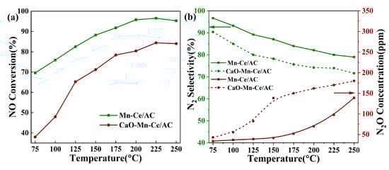 Figure 1a compares the deNOx activity of Mn-Ce/AC and CaO poisoning catalyst. Mn-Ce/AC catalyst achieved a high NO conversion of 69.4% at 75 °C, which may be mainly attributed to the NO adsorption capacity of AC. Mn-Ce/AC catalyst showed excellent SCR activity with the highest NO conversion of 96.5% at 225 °C. However, the SCR performance of the catalyst took place a noticeable change after doping CaO. The NO conversion of CaO poisoning catalyst decreased to 84.4% at 225 °C, which indicated that CaO on the AC surface inhibited the catalytic action of the Active components on AC. Noteworthily, the NO conversion was significantly decreased due to the load of CaO in the low temperature range of 75–125 °C. With the increase of temperature, the deactivation degree of CaO poisoning catalyst decreased. N2 selectivity and N2O concentration of the two catalysts are also displayed in Figure 1b. From Figure 1b, The N2 selectivity of all catalyst samples decreased as the temperature increased. CaO poisoning catalyst had the smaller N2 selectivity compared with Mn-Ce/AC catalyst. Therefore, loading CaO was unfavorable for keeping high N2 selectivity of the catalyst. Besides, More N2O was produced on the Mn-Ce/AC catalyst after loading CaO, which was a key factor in the decrease of N2 selectivity for CaO poisoning catalyst.