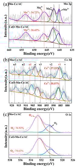 The XPS of O 1s was consisted of two peaks at 532.4 eV and 530.2 eV, belonging to the chemisorption oxygen (Oα) and lattice oxygen (Oβ), respectively [11,31]. From Figure 5c, the content of Oα for Mn-Ce/AC catalyst was 76.92%, while that for CaO poisoning catalyst decreased to 74.63%. Similar to the XPS result of Ce, the ratio of Oα also had a little decrease after doping CaO. The amount of the chemisorption oxygen (Oα) was closely related to the valence of Ce [29], so loading CaO had almost no effect on the state of oxygen.