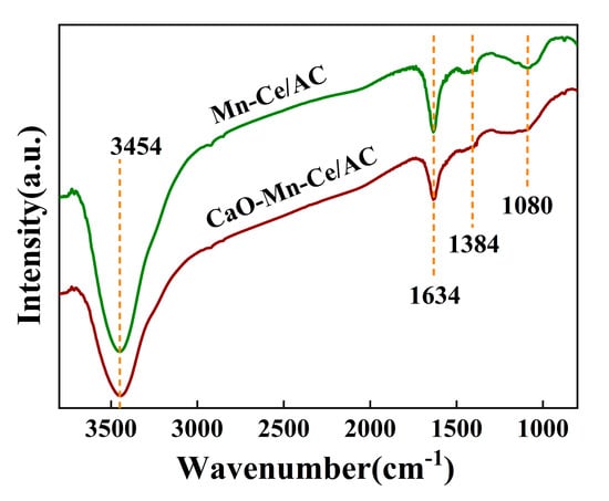 The FT-IR characterization was performed and the results are displayed in Figure 6. The FT-IR curves of both catalysts contained four bands at 1634, 3454, 1384 and 1080 cm−1, which was corresponded to the stretching of C=O, the stretching vibrations of –OH groups, aliphatic C-H groups and C-O-C groups, respectively [32,33,34,35]. Studies have shown that –OH and C=O groups could provide adsorption sites for NH3 and promote the transformation of ammonia gas (NH3(g)) to adsorbed ammonia (NH3(ads)) [10,36,37]. Besides, NH3 and NO were more easily adsorbed when functional groups existed on the AC surface [33,37]. From Figure 6, the intensity of the bands at 1384 and 1080 cm−1 became weak. Moreover, the intensity of the bands at 3454 and 1634 cm−1 decreased obviously. This indicated that all oxygen-containing functional groups were reduced to some extent after doping CaO. Therefore, the presence of CaO destroyed the oxygen-containing functional groups and inhibited the SCR performance of the catalyst.
