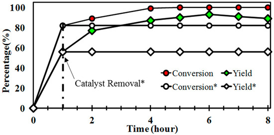 Time courses of the reaction of benzaldehyde using the Pd/carbon catalyst are shown in Figure 1. The highest yield of 93% for benzyl alcohol was obtained with >99% conversion of benzaldehyde at 6 h. As an another experiment, the solid catalyst was removed by filtration at 1 h, and the filtrate was continuously heated at 100 °C, where the conversion and yield unchanged significantly (open marks in Figure 1). Therefore, leaching of the catalytically active sites into the reaction mixture scarcely proceed for this reaction. Accordingly, it is suggested that the reduction proceeds heterogeneously with the Pd/carbon catalyst. The used Pd/carbon catalyst was recyclable at least twice without a significant loss of the conversion and yield (Figure S1).
