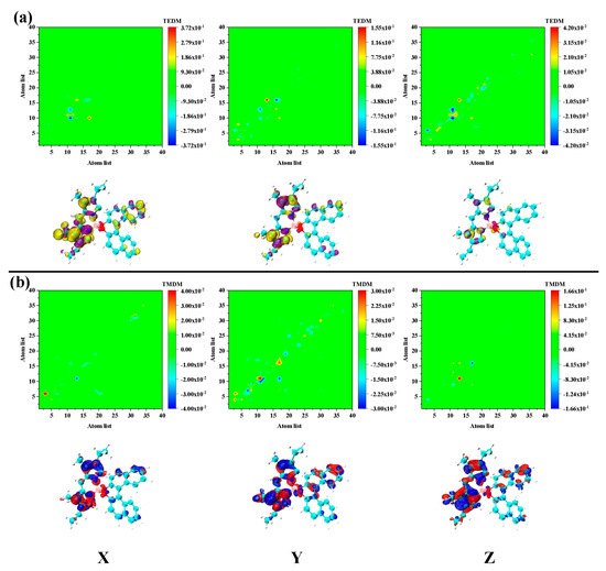 The transition electric (a) magnetic (b) dipole moment matrix (upper) and density (under) isosurface of S1 in PM567. The yellow and purple isosurfaces represent the positive and negative transition electric dipole moments, respectively, and the red and blue isosurfaces denote the positive and negative transition magnetic dipole moments, respectively.