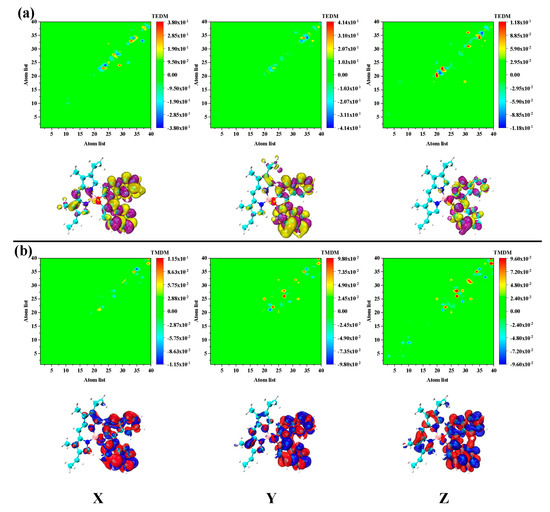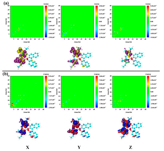 The transition electric/magnetic dipole moment deficiencies of these two excited states are significantly different. First, according to the previous statement, S3 is the excited state of charge transfer. However, the density of S3 transition magnetic dipole moment in the Y and Z directions is significantly higher than the electrical dipole moment density, as shown in Figure 6. The transition electric/magnetic dipole moment density distribution of S4 is basically the same as S3. However, the density distribution at the same location is the opposite, as shown in Figure 7. This is the fundamental reason why the ECD responses of S3 and S4 are opposing. The electromagnetic interaction of S4 is significantly different from other excited states. Firstly, the transition electric/magnetic dipole moment density of S6 is distributed in the binaphthalene part. Secondly, the transition electric/magnetic dipole moment density is exceptionally large, and significantly larger than the previous excited state, as shown in Figure 8. Correspondingly, the ECD peak of S6 is also extraordinarily strong. Based on the above analysis, the chiral mechanism of the molecule was quantitatively analyzed after combining the transition electric/magnetic dipole moments (TEDM/TMDM) separately. The values of the transition electric/magnetic dipole moments of five different excited states are shown in Table 1. We calculated the tensor product between TEDM and TMDM according to Equation (2). The last row in Table 1 shows the eigenvalues of the tensor product, and the results exactly match the intensity and direction of the ECD spectrum. This also showed that the analysis and discussion of the chiral mechanism mentioned above are complete and self-consistent.