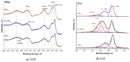 X-ray photoelectron spectroscopy (XPS) results for before and after ozonation are shown in Figure 5. The Ni2p region in the XPS spectrum displays characteristic signals attributed to , Figure 5a. Ozone did not change the spectrum in the region which is similar to previous DRX results. Furthermore, the comparison and showed similar spectra. The O1s region (Figure 5b) is decomposed in two main signals for and : the first at 529.3 eV corresponding to oxygen atoms lattice of NiO and the second around 531 eV assigned to defective oxygen, for instance oxygen atoms due to nickel vacancies [9]. When the ozonation was carried out, displays two additional peaks (at 531.8 eV (-CO) and 532.3 eV (-COH)) which are attributed to oxygen coordinated to carbon atoms by adsorbed byproducts generating to NP decomposition.