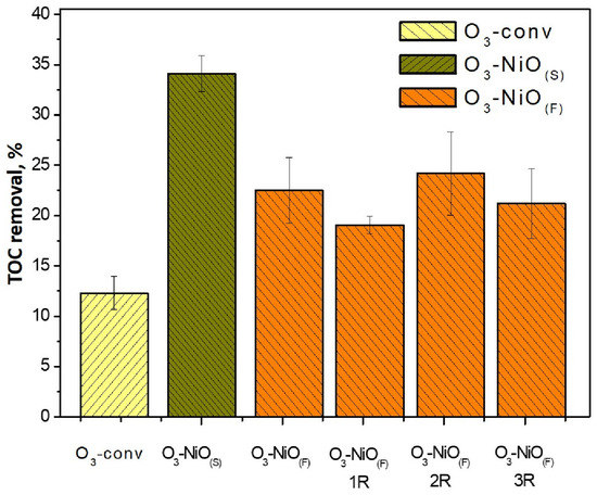 TOC removal (%) in conventional and catalytic ozonation and the effect of reusing films during three cycles with 10 films of NiO.