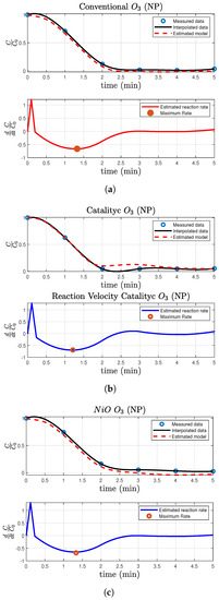 Table 1 summarizes all parameters used in the Super-Twisting algorithm (STA) to estimate the kinetics of the NP degradation by ozonation. The robustness of STA produces similar values for the needed parameters for tuning the differentiator. Figure 9 shows the time variation of signals produce by the modeling process that yields the kinetics and the approximate model of NP degradation by conventional and catalytic ozonations. In the first step, data are collected from the HPLC. These data are marked with a blue circle in all subfigures. Then, the black continuous line is obtained by an interpolation process (spline functions as an approximation basis). This step is done to have enough data to feed STA applied as a differentiator. The accuracy of the STA is related to the quality of the collected data. The derivative is presented in the second graph. During the first 40 s of simulation, STA presents an overshoot during the adaptation phase, which means it is the time when the value is reaching the zero value. After this time, the derivative is exact, and one may calculate the maximum rate of NP degradation. This rate is marked with a red circle in each graph and it is reported in Table 1. This process was repeated three times to compare the behavior of the ozonation cases studied in this manuscript.