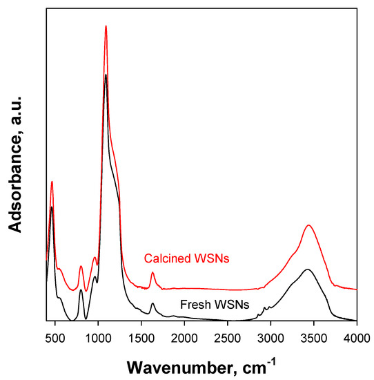 FT-IR spectra of WSNs before and after calcination at 450 °C.
