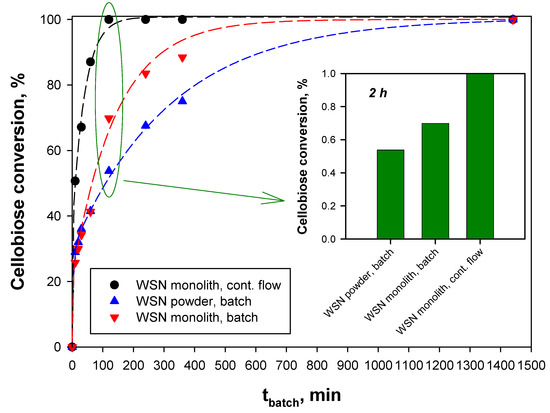 The monolith sample shows a higher conversion rate than the powder catalyst under the same reaction conditions, i.e., under batch reaction. The improved performance of the monolith sample under batch and mainly under continuous flow reaction conditions is evident by comparing the cellobiose conversion at a 2 h reaction time (or batch-equivalent contact time) reported in the inset of Figure 4. This is due to a better utilization of the active phase, related to the higher amount of adsorbed enzyme, the excess being placed in the monolith channels. Anyway, as shown later, the kinetic constants are quite the same. Full conversion is attained after 24 h. In the case of the monolith, different behavior is found when operating at batch or continuous mode: Complete conversion under continuous flow reaction conditions is attained at a batch-equivalent contact time equal to 120 min, much lower than the corresponding value obtained in the batch experiments (24 h).