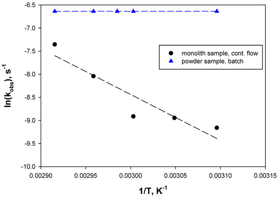 In Figure 5, the natural logarithm of the observed kinetic constant is plotted as a function of the reciprocal of the reaction temperature. The kinetic constant, i.e., the reaction rate, expressed by powder WSNs under batch reaction conditions is insensitive to the temperature, suggesting external mass transfer limitations. On the contrary, the reaction rate of the structured catalyst under continuous flow reaction conditions increases by increasing the temperature, suggesting kinetic limitation and, thus, faster mass transfer from the bulk of the solution to the biocatalyst surface. The deviation in the experimental points with respect to the linearity can be due to a mixed regime (limited kinetic and internal mass transfer) or to deviation in the kinetics from the first order, as approximated for the calculations (see Section 3.7).