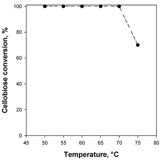 Figure 6 shows the effect of the temperature on the cellobiose conversion over the WSN monolith under continuous flow reaction conditions. By increasing the temperature up to 70 °C, a cellobiose conversion of 100% is retained; because a 2 h batch-equivalent contact time corresponds to the first full conversion detected at 50 °C, no deactivation occurs up to 70 °C. A further temperature increase causes a drastic performance reduction. These results agree with those reported on powder WSNs under batch reaction conditions [18] showing increased stability of the immobilized enzyme compared to the free one between 50 and 70 °C; this result suggests that neither washcoating onto the monolith walls nor the flow conditions affect the BG thermostability. As stated above, no deactivation occurs between 50 and 70 °C; however, due to the full conversion measured within this temperature range, an eventual activity increase could not have been measured. This eventuality is not so remote, because the calcined WSNs show a larger void fraction and, thus, lower mass transfer limitations, generally associated with constant activity at different temperatures.