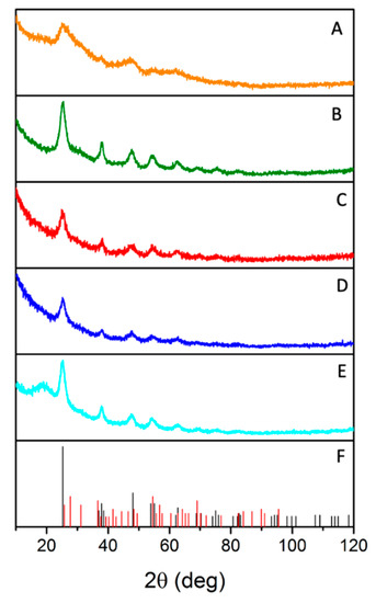 XRD experimental patterns of as prepared TiO2 nanoparticles (NPs) before (A), and after the thermal treatment in an oven at 110 °C for 2 h ((B), TiO2_2 h), 8 h ((C), TiO2_8 h), 16 h ((D), TiO2_16 h) and 24 h ((E), TiO2_24 h). Bragg hkl reflections positions for anatase phase (black line, panel (F)) and brookite phase (red line, panel (F)) respectively, are reported.