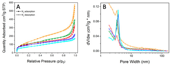 (A) N2 adsorption/desorption isotherms registered for the TiO2 NP samples as a function of temperature and duration time of the treatment. All the curves (type IV) are characteristic of mesoporous solids with H1-type hysteresis [37]. (B) Pore size distribution as dV/dw (cm3/g*nm) vs. pore width (nm) calculated by the Barrett-Joyner-Halenda (BJH) model on the desorption branch of isotherms for TiO2 samples. TiO2 samples are reported using following color code: TiO2_0 h (orange line), TiO2_2 h (green line), TiO2_8 h (red line), TiO2_16 h (blue line), TiO2_24 h (light blue line).
