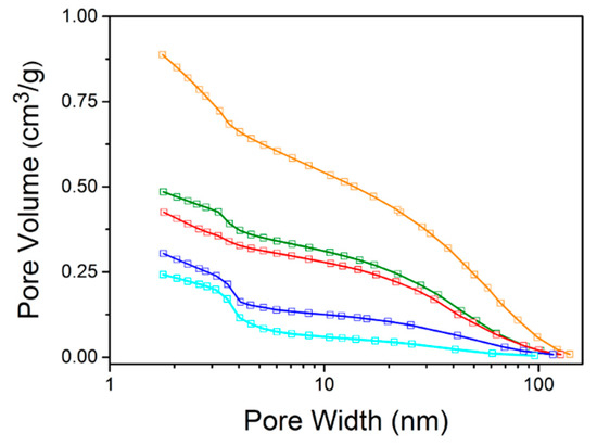Cumulative pore volume (cm3/g) vs. pore width (nm) calculated by BJH model on the desorption branch of isotherms for different TiO2 samples: TiO2_0 h (orange line), TiO2_2 h (green line), TiO2_8 h (red line), TiO2_16 h (blue line), TiO2_24 h (light blue line).
