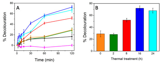 In Figure 9, the time course evolution of the MB decoloration assisted by the TiO2 NP samples obtained for increasing thermal treatment duration (panel A) is reported, while in panel B, the histogram showing the percentage of MB decoloration after 120 min of UV irradiation as a function of thermal treatment time is displayed. Negligible degradation is observed in the absence of a catalyst. For all samples, the adsorption of MB was also investigated, and the adsorption measured for all the investigated samples is of ca. (17 ± 5)% after 120 min. The reported data clearly highlight that the prepared TiO2 NPs are photoactive already before any thermal treatment, although with a not exceedingly high decoloration value, (29 ± 5)%. The photocatalytic performance does not significantly improve for the sample thermally treated for 2 h (TiO2_2 h) (28 ± 4)%. The TiO2_8 h sample shows an enhancement of the photocatalytic performance, with (52 ± 3)% of decoloration. A further increase in the duration of the thermal treatment systematically results in an increase in the photocatalytically assisted decoloration, up to (72 ± 4)% for the TiO2_16 h sample. Finally, for the TiO2_24 h sample, no significant difference in the extent of the decoloration ((68 ± 5)%) is observed, being, in fact the difference within the experimental error.