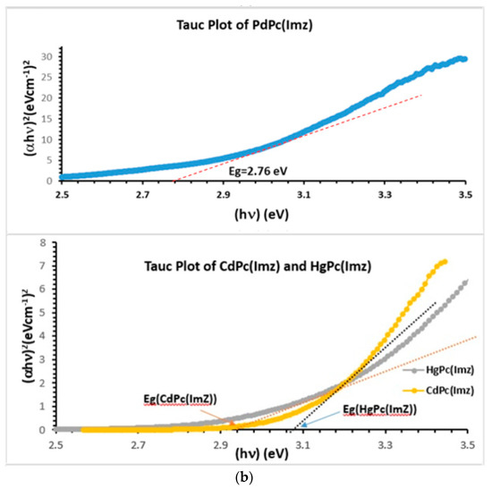 To find out the value of the optical band gap for semiconductor nanostructures [,], thin films [], and liquids [], Tauc plot is tremendously used. In the present study, Tauc plot was used to find out the value of the optical band gap of solutions containing MPc(Imz). Tauc plot is deduced from Figure 1a, and linear parts of the curves are extended to intersect with energy axis. The intersection point provides the value of the optical band gap Eg (Figure 1b). A substantial variation is observed in the value of indirect optical band gap of MPc(Imz) (M: Pd, Cd, Hg) (Table 1) when the same amount of MPc(Imz) was dissolved in DMSO. Among all solutions used in the present study, HgPc(Imz) solution showed highest value of the indirect optical band gap (2.94 eV), compared to CdPc(Imz) (2.87 eV) and PdPc(Imz) (2.76 eV) solutions. These optical bands Eg were determined from the analysis of the absorption spectrum as described by Tauc plot using the formula [,]:
