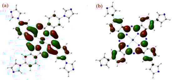 Virtual (a) LUMO and (b) HOMO orbital frontiers of PdPc molecule, the theoretical energy gap is 2.26 eV.