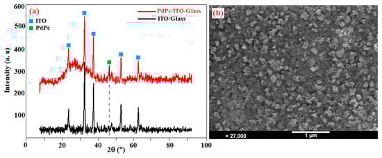 (a) XRD spectra and (b) SEM image of PdPc thin films grown by vacuum thermal evaporation technique on ITO/glass substrate.