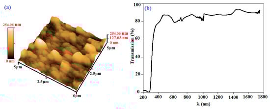 Figure 5a shows the 3D AFM image for an area of 5 µm × 5 µm of the palladium phtalocyanine thin film surface. The image exhibits a rough surface, with forms that might indicate that phthalocyanine molecules grew in aggregation rows, rather than in the parallel or in the zig-zag arrangement. This suggests that the roughened surface of the thin film would be due to growth mechanism of the technique. Figure 5b shows the transmittance data of the prepared PdPc/ITO thin film in the range of 200–1800 nm. The most important feature in this figure is the shift of the absorption band edge toward the lower wavelengths. This shift is translated as optical band gap enlargement. Furthermore, a high absorption region can be noted at wavelengths λ < 350 nm, allowing energy gap value adjustment. A direct energy gap is observed for PdPc, whereas for a semiconductor with indirect gap, it is degraded. A second high transparency region is also observed at λ > 350 nm, giving a transparent character to the thin layers.