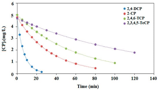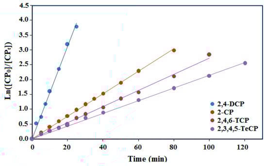 where kobs represents the apparent rate constant, [CP]0 is the initial concentration (mg·L−1), [CP]t is the t time concentration. By plotting ln([CP]0/[CP]t) versus irradiation time, a straight line was observed for all compounds with a slope of kobs (Figure 7).