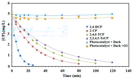 All of the four experiments showed a good fit for the pseudo-first-order model. However, the 2,4-DCP photocatalytic experiment with an initial concentration of 5 mg L−1 (39 µmol min−1) had a better fit than the other chlorophenols (2-CP, 2,4,6-TCP and 2,3,4,5-TeCP). Based on the results depicted in Table 2 and Figure 7, it can be concluded that the reactivity of the chorophenols decreases with the increasing number of chlorine atoms on the aromatic ring. The first order degradation rate constants (kob) may be influenced by the interaction of the chlorine electron withdrawing and the steric effect of the chlorine, which can block some favorable positions susceptible to the hydroxyl radical attack. For tetra-chlorophenols (2,3,4,5-TeCP), steric hindrance plays an important role during their dechlorination process. Indeed, the dechlorination process is all the more difficult as the chlorine atoms are closer to each other on the aromatic cycle. The rate constant value of 2,3,4,5-TeCP obtained at pH = 8 (kobs = 20 × 10−3 min−1) is in good agreement with the results obtained at pH 11 by Czaplicka et al. [] (kobs = 18.3 × 10−3 min−1). Moreover, the oxidation of the monochlorophenols was faster than that of the trichlophenols and tetrachlorophenols, but less easy than the dichlorophenols. Figure 8 shows the photocatalytic degradation of each chlorophenol during different illumination times and in the presence or the absence of the photocatalyst (PdPc(Imz)/ITO/glass thin films). This photocatalyst did not exhibit any photoactivity in the dark, neither in the absence nor in the presence of oxygen (Figure 8), suggesting that it is necessary to photoexcite the photosensitizer (PcPd(Imz)). Furthermore, the increase of the number of chlorine atoms has a significant effect on the initial rates (r0) as well as the degradation rate constants (kobs). The values of (r0) for 2,4-DCP, 2-CP, 2,4,6-TCP and 2,3,4,5 TeCP were 3.10, 1.26, 0.67, and 0.40 µmol min−1, respectively. This can be explained by the fact that the excited molecules have different polarizations.