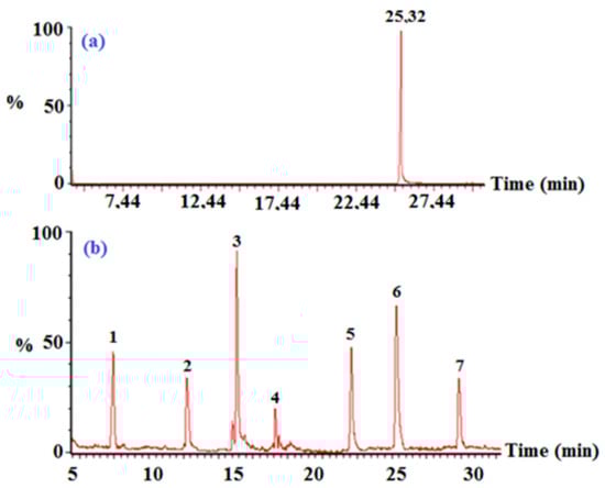 (a) Total ion chromatogram of 2,3,4,5-TeCP at t = 0; and (b) after 120 min illumination time: (1) 2,3,5-TCP, (2) 2,3,4-TCP, (3) 3,5-DCP, (4) dichlorodihydroxy-benzene, (5) 3,4,5-trichlorocatechol, (6) 2,3,4,5-TeCP, and (7) 3,4,5-TCP ([TeCP]0 = 5 mg/L, pH = 8).
