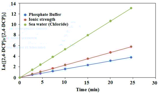 A series of experiments were carried out to determine whether the major ion composition of seawater could affect the photocatalytic degradation rate of chlorophenols. To approximate the composition of the Red Sea, the results reported by Masoud et al. [] were used to create the synthetic seawater solution employed to study the effect of the composition of other ions on the rate of degradation of 2,4-DCP. Synthetic seawater containing 680 mM NaCl, 4.55 µM Na2PO4, 0.2 µM Iron, 1.29 µM KNO3, and 1.49 mM CaCO3 as total alkalinity were prepared using reagent-grade chemicals. Figure 13 shows the effect of seawater constituents on photodegradation rate in synthetic matrices of 2,4-DCP at initial concentration of 5 mg/L, compared to seawater chlorine 680 mM.