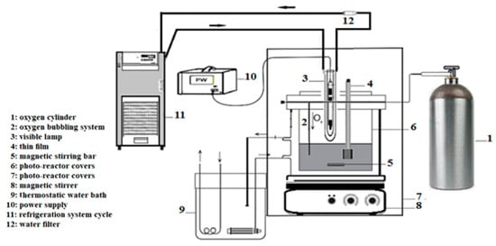 In order to simulate contaminated sea water condition, synthetic seawater sample was spiked with appropriate amounts of stock solutions of a mixture of four chlorophenols. Based on previous works in our laboratory [,], photocatalytic degradation was achieved using a self-made designed photoreactor with slight modifications (Figure 14). A Lightex LT50 lamp with 128 W was used as a source of illumination and immersed in the reactor at a distance of 1 cm from the film supported on the ITO/glass substrate. Throughout the photocatalytic process, the solution enriched with chlorophenols was saturated with oxygen. The duration of illumination for each run was set at 140 min to ensure maximum degradation of the chlorinated phenols. 25 mL of mixed chlorophenols spiked in synthetic seawater solution (5 ppm) was used as target solution. The pH value of the batch reaction was fixed at 8.0 and the temperature in the photo-reactor set at 300 K with oxygen bubbling inside the reaction medium. At different intervals of illumination, a 5 mL aliquot containing the unreacted chlorophenols was taken and filtered through 0.45 µm cellulose esters (MCE) membrane (MF-Millipore). After acetylation and centrifugation, 1 µL aliquot of the organic phase was injected into the GC–MS system after pre-concentration and solid-phase extraction (SPE) clean-up procedure. The concentration of unreacted chlorophenols was determined to establish a calibration curve with concentration values ranging from 1 to 100 mg/L. For each test, three measurements were undertaken. Calibration curves showed good linearity with correlation coefficients (R2) ranging from 0.9972 to 0.9998 for all the chlorophenols.