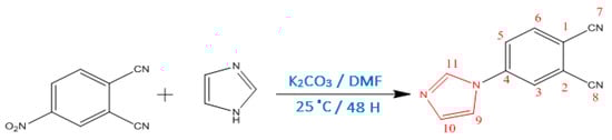 The synthesis of 4-(1H-imidazol-1-yl)phthalonitrile was carried out by base-catalyzed aromatic nitro displacement of 4-nitrophthalonitrile with 1,3-Diaza-2,4-cyclopentadiene, in DMF; K2CO3 was used as the base for this displacement (Scheme 1).