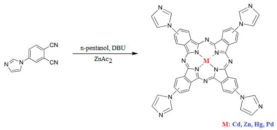 The desired metallophthalocyanines were synthesized in a one-step reaction by cyclotetramerization of 4-(1H-imidazol-1-yl) phthalonitrile (3 mmol) in the presence of n-pentanol using DBU as the catalyst, in 2-(dimethylamino)ethanol (DMAE) under an inert atmosphere, at 140 °C for 18 h and stirred during one day to increase the yield (Scheme 2). We conducted the reaction in the presence of anhydrous metal salts [Cd(OAc)2, Hg(OAc)2, Pd(OAc)2 and Zn(OAc)2] (1 mmol) at reflux temperature. 1H NMR, MALDI-TOF-MS, and UV–Vis analyses confirmed the proposed structures of the synthesized compounds. All phthalocyanines displayed good solubility in DMSO, DMF, chloroform, and THF.