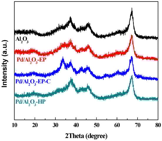 Figure 1 illustrates the X-ray diffraction (XRD) patterns of Pd/Al2O3-EP, Pd/Al2O3-EP-C, Pd/Al2O3-HP, and Al2O3 support. There are four characteristic diffraction peaks of Al2O3 support at 32.8°, 37.3°, 45.9°, and 67.2°, as shown in Figure 1 (JCPDS No. 04-0877). As a result of the covering effect of Pd species, the characteristic diffraction peaks of Al2O3 support in Pd/Al2O3-EP, Pd/Al2O3-EP-C, and Pd/Al2O3-HP are reduced to some extent. It can be seen from the XRD patterns of Pd/Al2O3-EP, Pd/Al2O3-EP-C and Pd/Al2O3-HP that there is no obvious characteristic diffraction peak of metal Pd, which may be ascribed to the high dispersion of Pd nanoparticles on the surface of the Al2O3 support [,,,] and (or) the low Pd content of the samples []. The XRD pattern of Pd/Al2O3-EP-C shows three diffraction peaks at 33.9°, 41.9°, and 54.8°, corresponding to the (101), (110), and (111) crystal planes the tetragonal PdO structure (JCPDS No. 41-1107), which is in line with the transmission electron microscopy (TEM) results (Figure 2). It suggests that some oxidized Pd species in Pd/Al2O3-EP-C are formed due to the calcination at high temperature in air atmosphere. Baylet et al. also observed a similar phenomenon [].