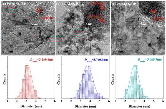 Transmission electron microscopy (TEM) images of (a) Pd/Al2O3-EP, (b) Pd/Al2O3-EP-C, (c) Pd/Al2O3-HP, and the corresponding histograms of size distributions of the Pd nanoparticles and HRTEM images (insets).