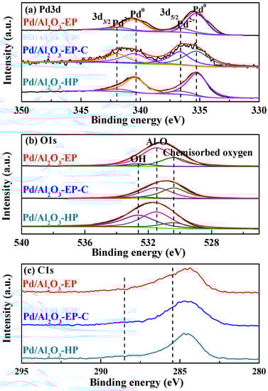 Ethanol dissociation in cold plasma can not only generate active reducing species, but can also generate carbon species [,]. The C1s XPS of the three samples were analyzed to study the generation and removal of the carbon species. When compared to Pd/Al2O3-HP, the intensity of C1s XPS spectrum for Pd/Al2O3-EP is stronger, as shown in Figure 3c. Two curves at 288.5 and 285.5 eV can be fitted with the C1s XPS spectrum in Pd/Al2O3-EP, ascribing to the C-O [] and amorphous carbon species [] derived from ethanol dissociation in cold plasma. As far as Pd/Al2O3-EP-C is concerned, the intensity of the two peaks are decreased, revealing that the calcination process can remove the residual carbon species, which is in line with the TG/DTG results (Figure S2).