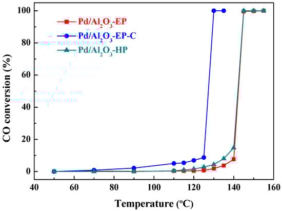 Catalytic activity of Pd/Al2O3-EP, Pd/Al2O3-EP-C, and Pd/Al2O3-HP catalysts for CO oxidation.