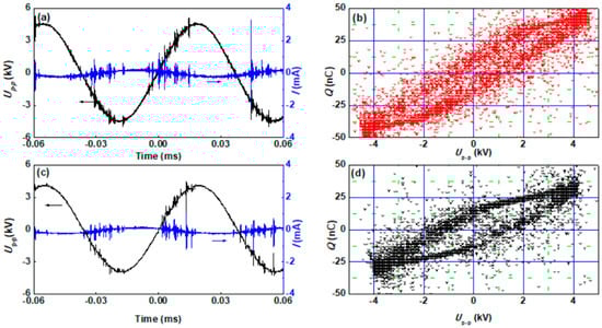 The discharge voltage and current waveforms, and the corresponding Lissajous figures of (a,c) the “storage-discharge” ethanol cold plasma and (b,d) hydrogen cold plasma for synthesis of Pd/Al2O3 catalysts.