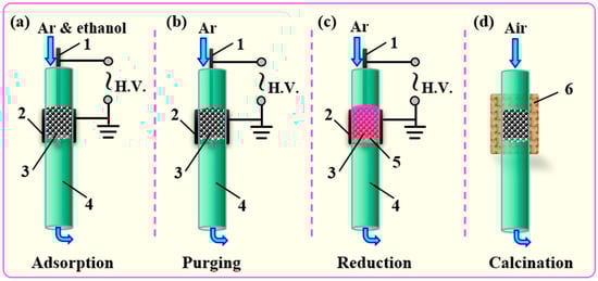 Schematic diagram of Pd/Al2O3 catalysts synthesis using “storage-discharge” ethanol cold plasma: (a) Adsorption of ethanol; (b) Purging of the physically adsorbed ethanol; (c) Cold plasma reduction; (d) Removal of the residual carbon species by calcination. 1-inner electrode, 2-ground electrode, 3-catalyst, 4-quartz tube, 5-plasma zone, and 6-furance.