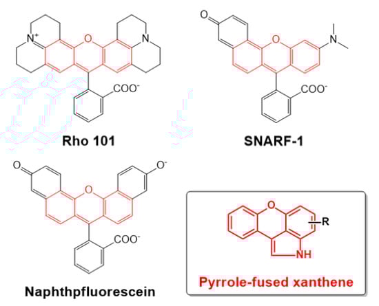 Xanthene-based fluorescent dyes largely containing fluorescein and rhodamine have attracted continuous attention from researchers because of their good photophysical properties such as high absorption coefficient, high photostability, and high fluorescence quantum yield [1,2,3,4,5,6,7,8]. However, absorption and emission wavelengths of many xanthene derivatives are in the ultraviolet-visible light range below 600 nm, which makes them unsuitable for bioimaging in living systems [9]. An important modification to the dyes is the introduction of a fused aryl ring into the xanthene skeleton. This modification brings a remarkable bathochromic shift in excitation and emission wavelengths [10]. The classic examples are Rho 101, naphthoxanthene, and SNARF-1, which exhibit much longer wavelengths than those of rhodamine and fluorescein under basic conditions (Figure 1) [11,12,13].