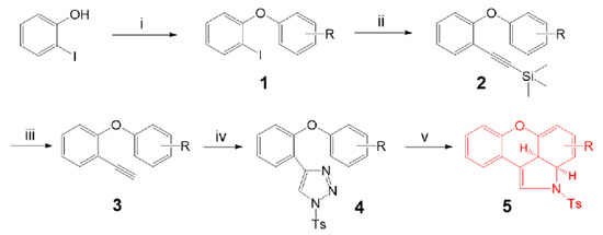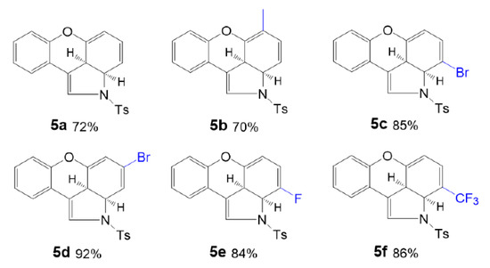 Firstly, the substituted phenylboronic acids were coupled with 2-iodophenol in the presence of Cu(OAc)2 to provide 1-iodo-2-phenoxybenzene 1. Iodine was converted to a trimethylsilylacetylene (TMSA) functional group using PdCl2(PPh3)2 and CuI as the catalysts, and then trimethylsilyl was removed in CH2Cl2 solution containing K2CO3 to give 1-ethynyl-2-phenoxybenzene 3 [48]. Subsequently, the key intermediate N-tosyl-4-(2-phenoxyphenyl)-1,2,3-triazole 4 was obtained via (3+2) cycloaddition of 3 with tosyl azide in the presence of CuTc. When the triazole 4 reacted with rhodium(II) octanoate dimer in toluene at 80 °C for 4 h, the desired tetracyclic compound 5 was obtained after chromatography purification. The results delineated the scope of the (3+2) annulation reaction as shown in Scheme 1. Substrates possessing the electron-withdrawing groups smoothly reacted, and the corresponding products 5c–5f were isolated in yields ranging from 84% to 92%. The unsubstituted and electron-donating group substituted substrates also successfully involved in the transformation with yields of 72% and 70%, respectively (5a and 5b). The stereochemistry of the tetracyclic products was analyzed by 1H NMR data of 5a–5f. H atoms on the methenyl group showed relatively large coupling constants (J = 14.0–15.8 Hz). Narasaka K. et al. reported a series of cis- and trans-fused (4,5,6,7-η)-3a,7a-dihydro-3H-indoles, in which the J of the cis-fused isomer was much larger than the trans- one [49]. Similarly, the coupling constants of cis-fused indole derivatives in Murakami’s report were also up to 14 Hz [42]. Thus, the compounds 5a–5f were considered as cis-fused isomers.