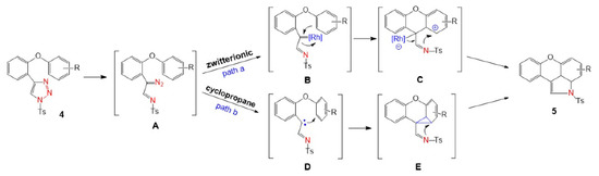 We next speculated the possible mechanism for the production of the tetracyclic 3,4-fused dihydroindole 5 (Scheme 2). An α-diazo imino A was formed by reversible tautomerization from the corresponding triazole 4. The intermediate α-imino rhodium carbene B was obtained with the release of N2 (g) when A rapidly reacted with rhodium (II). Subsequently, the intramolecular electrophilic reaction of B occurred to form the zwitterionic intermediate C. The anionic rhodium released bonding electrons, completing the second cyclization [42]. The intermediate A acts as a 1,3-dipole equivalent due to the nucleophilic character of the imino nitrogen. According to Davies report [47], alternatively, α-diazoimine A undergoes thermal decomposition to generate free carbene D, which could cyclopropanate an arene to give norcaradiene E. The intermediate E does not have the correct geometry to undergo a (3,5)-sigmatropic rearrangement to give 5.