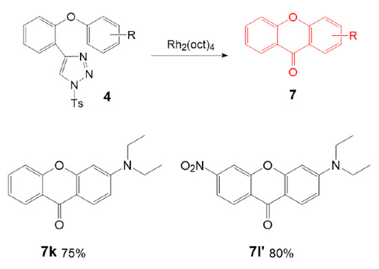 The present reaction was also used to synthesize xanthone 7 from triazole diaryl ether 4, as shown in Scheme 4. When N,N-diethyl substituted 4k in toluene and was catalyzed by Rh2(oct)4 at 80 °C, no pyrrole-fused xanthene skeleton was obtained. Instead, the corresponding xanthone 7k was obtained in 75% isolated yield. After the first cycloaddition to form intermediate C, the strong electron-donating substituent N(C2H5)2 weakened the electropositivity of the allyl position, which was unfavorable for the second cyclization with the imino nitrogen. The tosyl amide was further oxidized to a carbonyl group in air, affording a stable xanthone derivative. Similarly, the substrate 4l’ with an intense electron-donor group diethyl amine also underwent a single cycloaddition reaction to give xanthone 7l’ in 80% yield. Shen et al. reported a similar process for the synthesis of N-methyl acridone derivatives [50]. The triazole intermediate was converted to acridone by rhodium catalysis via a single cycloaddition.