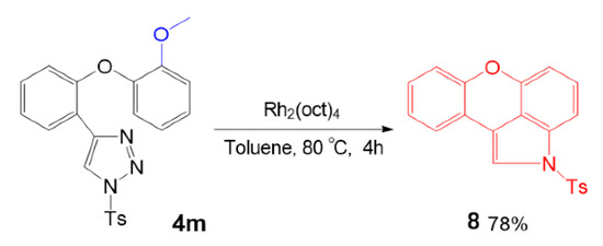 In addition, a special case of the rhodium catalysis process was obtained for the O-methoxy substrate. The (3+2) annulation reaction of N-tosyl-4-(2-phenoxyphenyl)-1,2,3-triazole 4m took place by Rh2(oct)4 in toluene under the same conditions. However, oxidative aromatization directly occurred during the process of annulation, and also the O-methoxy group was simultaneously removed, affording the aromatized pyrrole-fused xanthene 8 with 78% yield (Scheme 5). Due to the rotatable C-O bond in diaryl ether, the carbenoid carbon of B is electrophilic to react with methoxyl site. When intramolecular attack of the phenyl ring in the methoxyl site occurs to furnish the zwitterionic intermediate, methoxyl as a good leaving group could be removed. In the tested substrates, only O-methoxy-substituted triazole could be aromatized, retaining a tosyl group in the oxidation process.