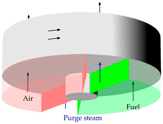 The rotating bed reactor (see Figure 4) essentially is a donut-shaped fixed bed, with several sections that continuously rotate between the different reacting gas streams [85,86,87]. Between the two reacting gases, inert gas (such as steam) is preferably introduced to avoid mixing of the two reacting gases [76]. This is the most critical challenge for the use of this reactor type [76]. The practical operation of such a rotary reactor requires proper selection of reactor geometry, rotating speeds, and gas flow rate to ensure efficient fuel conversion and CO2 separation [88]. The reactor geometry needed for achieving full conversion strongly depends on the type of oxygen carrier used. Ni, for example, has very fast reduction kinetics, but the oxidation kinetics is slightly slower compared to other oxygen carrier types [86,87]. Furthermore, the reactor temperature profile, which greatly affects reactor performance [88], changes depending on the used oxygen carrier. A combination of rotational speeds and appropriate selection of seals can be used to minimize leakages and gas bypass during operation [88].