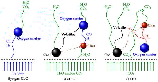 Main reaction mechanisms involved in solid-fuel combustion in the three different chemical looping combustion processes, proposed for solid fuels. Reprinted from [20], with permission from Elsevier. CLC: chemical looping combustion, iG-CLC: in situ gasification chemical looping combustion, CLOU: chemical looping with oxygen uncoupling.
