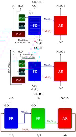 Process schemes of steam reforming-chemical looping reforming (SR-CLR), autothermal chemical looping reforming (a-CLR), and chemical looping for hydrogen generation, adapted from [105,107,111]. Acronyms include FR: fuel reactor, AR: air reactor, WGS: water-gas shift reactor, Cond: condenser, PSA: pressure swing adsorption unit, and SR: steam reactor.